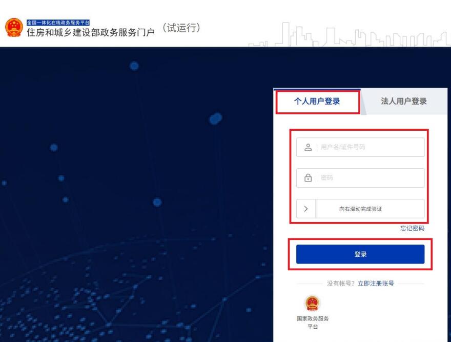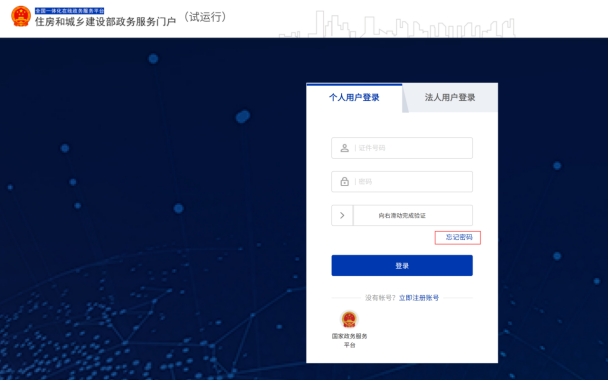 在“住房和城鄉(xiāng)建設(shè)部政務(wù)服務(wù)門戶”頁面(圖1),點擊【登錄】(圖3)進入登錄界面(圖4)。