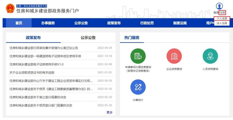 用戶進入“住房和城鄉(xiāng)建設(shè)部政務(wù)服務(wù)門戶”頁面(圖1),點擊【注冊】(圖1)進入個人用戶注冊界面(圖2),按照提示完成賬號注冊。