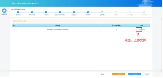 部分申請事項(xiàng)需要企業(yè)在申請流程中上傳與本次申請相關(guān)的附件,則申報(bào)流程會(huì)包含“上傳材料”環(huán)節(jié)。在“上傳材料”環(huán)節(jié)頁面上傳本次申請要求的附件,上傳完成后點(diǎn)擊“下一步”進(jìn)入下一個(gè)環(huán)節(jié)。