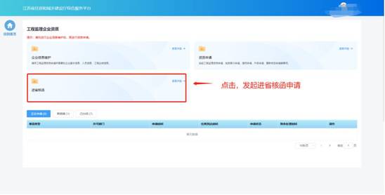 企業(yè)吸收省外工程監(jiān)理企業(yè)資質(zhì)之前,需要先對省外工程監(jiān)理企業(yè)資質(zhì)進(jìn)行進(jìn)省核函。點(diǎn)擊工程監(jiān)理企業(yè)資質(zhì)功能模塊頁中“進(jìn)省核函”圖標(biāo)發(fā)起對省外企業(yè)資質(zhì)的核函申請。后續(xù)其他步驟說明可參考建筑業(yè)企業(yè)-進(jìn)省核函。