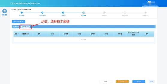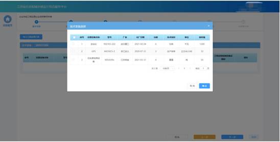 若申請的資質(zhì)對于技術(shù)裝備有要求,則申報(bào)流程會(huì)包含“技術(shù)裝備”環(huán)節(jié)。在“技術(shù)裝備”環(huán)節(jié)頁面,企業(yè)按照所申請資質(zhì)類別分別選擇對應(yīng)的技術(shù)裝備。點(diǎn)擊“選擇技術(shù)裝備”按鈕,選擇用于本次申報(bào)的裝備。