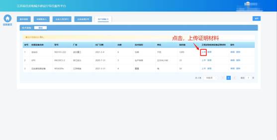 添加設(shè)備后,在“工程試驗(yàn)檢測設(shè)備證明材料”列中點(diǎn)擊“上傳”按鈕
