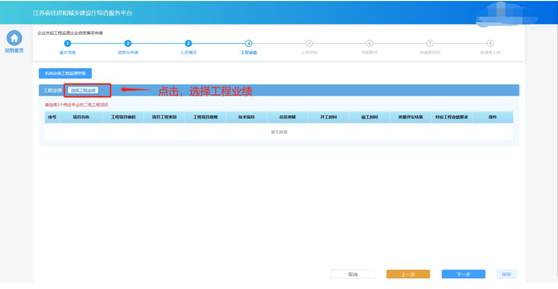若申請的資質(zhì)對于企業(yè)業(yè)績有要求,則申報(bào)流程會(huì)包含“工程業(yè)績”環(huán)節(jié)。在“工程業(yè)績”環(huán)節(jié)頁面,企業(yè)按照所申請資質(zhì)類別分別選擇對應(yīng)的業(yè)績。點(diǎn)擊“選擇工程業(yè)績”按鈕,選擇用于本次申報(bào)的業(yè)績。