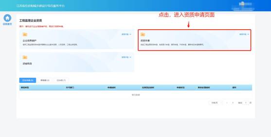 在進(jìn)行企業(yè)信息維護(hù)后,點(diǎn)擊工程監(jiān)理企業(yè)資質(zhì)功能模塊頁中“資質(zhì)申請”進(jìn)入資質(zhì)申請頁面。