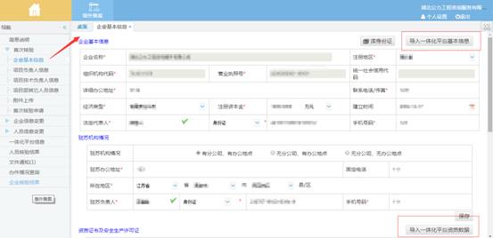 拖動(dòng)頁(yè)面右側(cè)的下拉條,顯示證書頁(yè)面,點(diǎn)擊右側(cè)的【導(dǎo)入一體化平臺(tái)基本信息】按鈕,導(dǎo)入企業(yè)在一體化平臺(tái)中的數(shù)據(jù)。