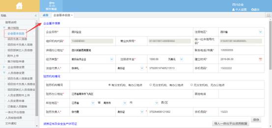3.3.2首次核驗(yàn) 3.3.2.1企業(yè)基本信息打開【企業(yè)基本信息】,進(jìn)入基本信息填寫頁(yè)面。點(diǎn)擊頁(yè)面右上角的【導(dǎo)入一體化平臺(tái)基本信息】按鈕,導(dǎo)入企業(yè)在一體化平臺(tái)中的數(shù)據(jù),有的時(shí)候,一體化平臺(tái)的數(shù)據(jù)會(huì)不全,這個(gè)時(shí)候就要求我們手動(dòng)填寫數(shù)據(jù)。