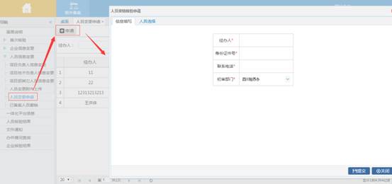 3.3.4.5人員變更申請(qǐng)如果人員信息發(fā)生了變更,就需要對(duì)人員的變更提出申請(qǐng)。點(diǎn)擊【人員變更申請(qǐng)】,彈出人員變更申請(qǐng)的提示框,同樣需要輸入經(jīng)辦人以及經(jīng)辦人的身份證,聯(lián)系電話和選擇審核的部門。