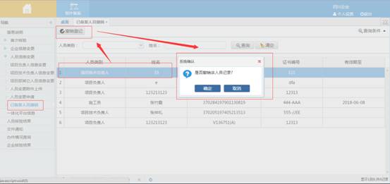 如果企業(yè)已經(jīng)備案成功,但是出現(xiàn)了人員調(diào)離的情況,就需要對(duì)人員進(jìn)行撤銷操作。點(diǎn)擊【已備案人員撤銷】出現(xiàn)人員撤銷列表。列表中顯示的是企業(yè)的所有人員信息。如果需要撤銷人員,則選中需要撤銷的人員,再點(diǎn)擊【撤銷登記】按鈕即可。