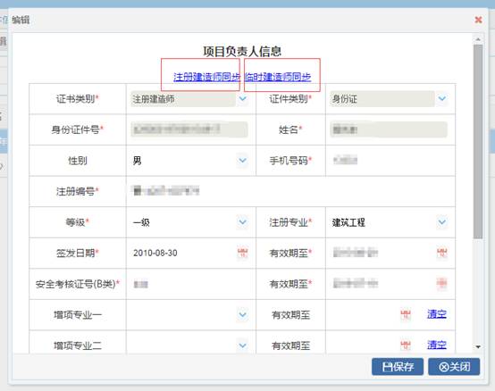 如果該負(fù)責(zé)人是“注冊(cè)建造師”或“臨時(shí)建造師”那么就會(huì)有同步按鈕。如果是注冊(cè)建造師,則先點(diǎn)擊【注冊(cè)建造師同步】按鈕,將該一級(jí)建造師的信息從一體化平臺(tái)中同步過(guò)來(lái),如果提示【無(wú)法匹配人員】,則需要和一體化平臺(tái)核實(shí)是否有該人員。臨時(shí)建造師同。