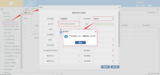 如果添加的是注冊(cè)建造師和臨時(shí)建造師,則該人員是必須在一體化平臺(tái)中已經(jīng)備案成功的人員。且人員證書必須和一體化人員中的信息相同。不然就會(huì)提示“無(wú)法匹配人員,請(qǐng)重新輸入證件號(hào)”。如果需要添加,則需要聯(lián)系當(dāng)?shù)氐南嚓P(guān)部門處理。