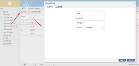 3.3.3.3企業(yè)信息變更申請(qǐng)企業(yè)備案成功后,如果企業(yè)的基本信息出現(xiàn)了變更,那么就需要進(jìn)行【企業(yè)變更申請(qǐng)】,及時(shí)更新備案數(shù)據(jù)。發(fā)起申請(qǐng)的時(shí)候,需要輸入經(jīng)辦人以及經(jīng)辦人的身份證,聯(lián)系電話和選擇審核的部門。