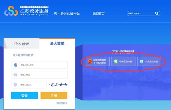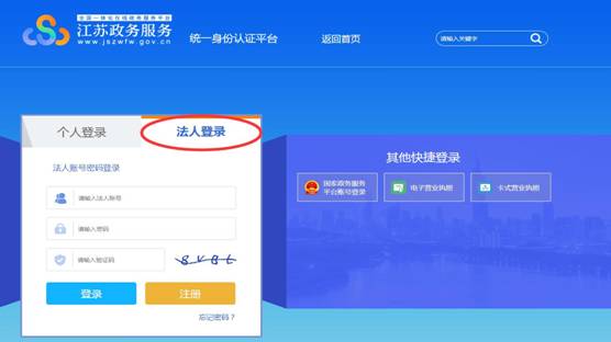 1、江蘇省政務(wù)服務(wù)網(wǎng)用戶登陸與注冊企業(yè)用戶至“江蘇省政務(wù)服務(wù)網(wǎng)”“江蘇住建廳旗艦店”“企業(yè)服務(wù)”“施工資質(zhì)及安全生產(chǎn)許可證”“法人登錄”模塊(http://www.jszwfw.gov.cn/jsjis/front/login.do?uuid=Jlb0eF7WUuM3)直接登陸或注冊法人賬戶。