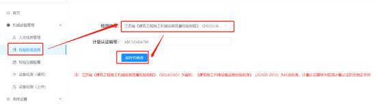 3.2檢測(cè)標(biāo)準(zhǔn)配置檢測(cè)流程開始前,檢驗(yàn)檢測(cè)機(jī)構(gòu)在系統(tǒng)中選擇檢驗(yàn)標(biāo)準(zhǔn)。點(diǎn)擊下拉框選擇使用的標(biāo)準(zhǔn),填寫檢測(cè)機(jī)構(gòu)的計(jì)量認(rèn)證編號(hào),點(diǎn)擊【保存并修改】完成配置。