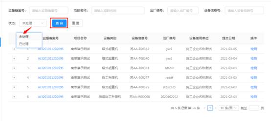 可根據(jù)項(xiàng)目名稱(輸入框)、設(shè)備類型(選擇框)、設(shè)備型號(hào)(輸入框)、檢驗(yàn)編號(hào)(輸入框)、狀態(tài)(選擇框)、設(shè)備信息號(hào)(輸入框)、出場(chǎng)編號(hào)(輸入框)其中一項(xiàng)或多項(xiàng)對(duì)施工企業(yè)項(xiàng)目部申請(qǐng)檢驗(yàn)檢測(cè)的機(jī)械設(shè)備進(jìn)行模糊查詢。點(diǎn)擊【重置】清空當(dāng)前選擇及輸入的內(nèi)容。