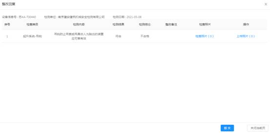 點(diǎn)擊菜單欄的起重機(jī)械管理—>設(shè)備檢測(cè),需整改的檢測(cè)機(jī)械設(shè)備顯示在列表中的第一條,最新狀態(tài)欄顯示待整改狀態(tài)及操作欄出現(xiàn)【整改回復(fù)】按鈕,點(diǎn)擊查看【整改回復(fù)】按鈕可查看需整改的具體不合格項(xiàng)。
