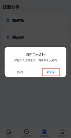 ①點(diǎn)擊“注冊申報(bào)”進(jìn)入到申報(bào)頁面時,平臺自動校驗(yàn)個人基本信息是否完整。如個人基本信息不完整,平臺提示更新個人基本信息,點(diǎn)擊【去更新】維護(hù)個人信息。