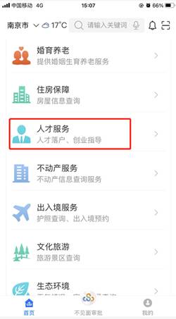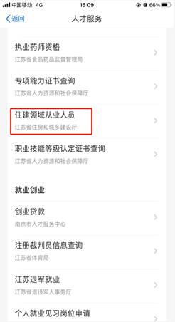 職業(yè)資格人員登錄“江蘇政務(wù)服務(wù)”APP,“首頁”→“江蘇政務(wù)服務(wù)(城市名)”→“人才服務(wù)”→“住建領(lǐng)域從業(yè)人員”進(jìn)入應(yīng)用。如圖: