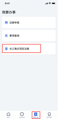 點(diǎn)擊“我要辦事”→“長三角示范區(qū)注冊”。如圖:
